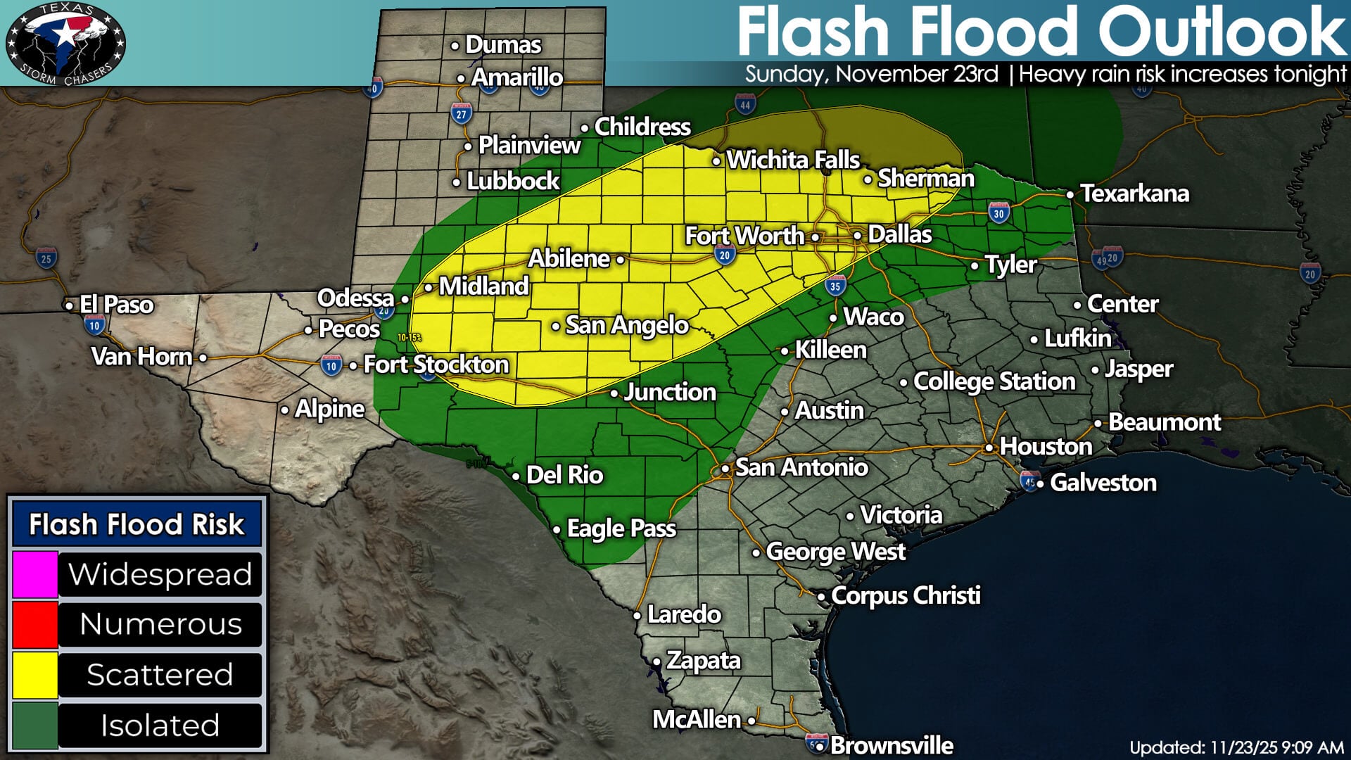 Multiple rounds of thunderstorms are expected tonight from Abilene to DFW, then northeast along I-30 toward Texarkana. This corridor faces the highest flood risk overnight.