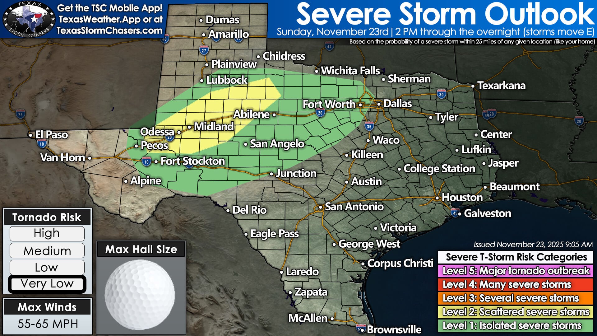 The Storm Prediction Center has upgraded to a Level 2 of 5 risk along the I-20 corridor from near Pecos through Odessa–Midland, Snyder, Sweetwater, Abilene, and into parts of North Texas.