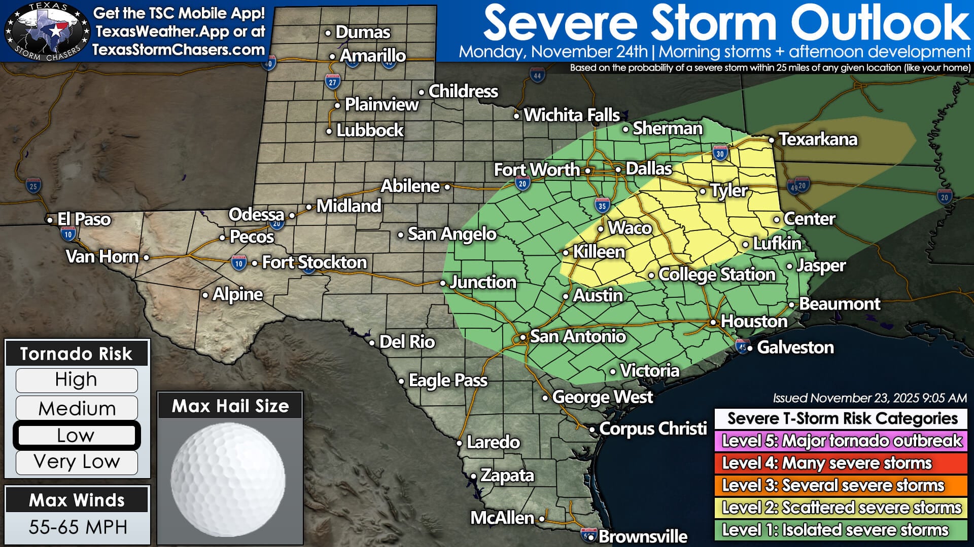 Most of the Hill Country, South Central Texas, South Texas, and Edwards Plateau will end up on the quieter, southern side of the system. Isolated storms may occur, but widespread severe weather or significant flooding is not expected south of I-10 and west of I-35.